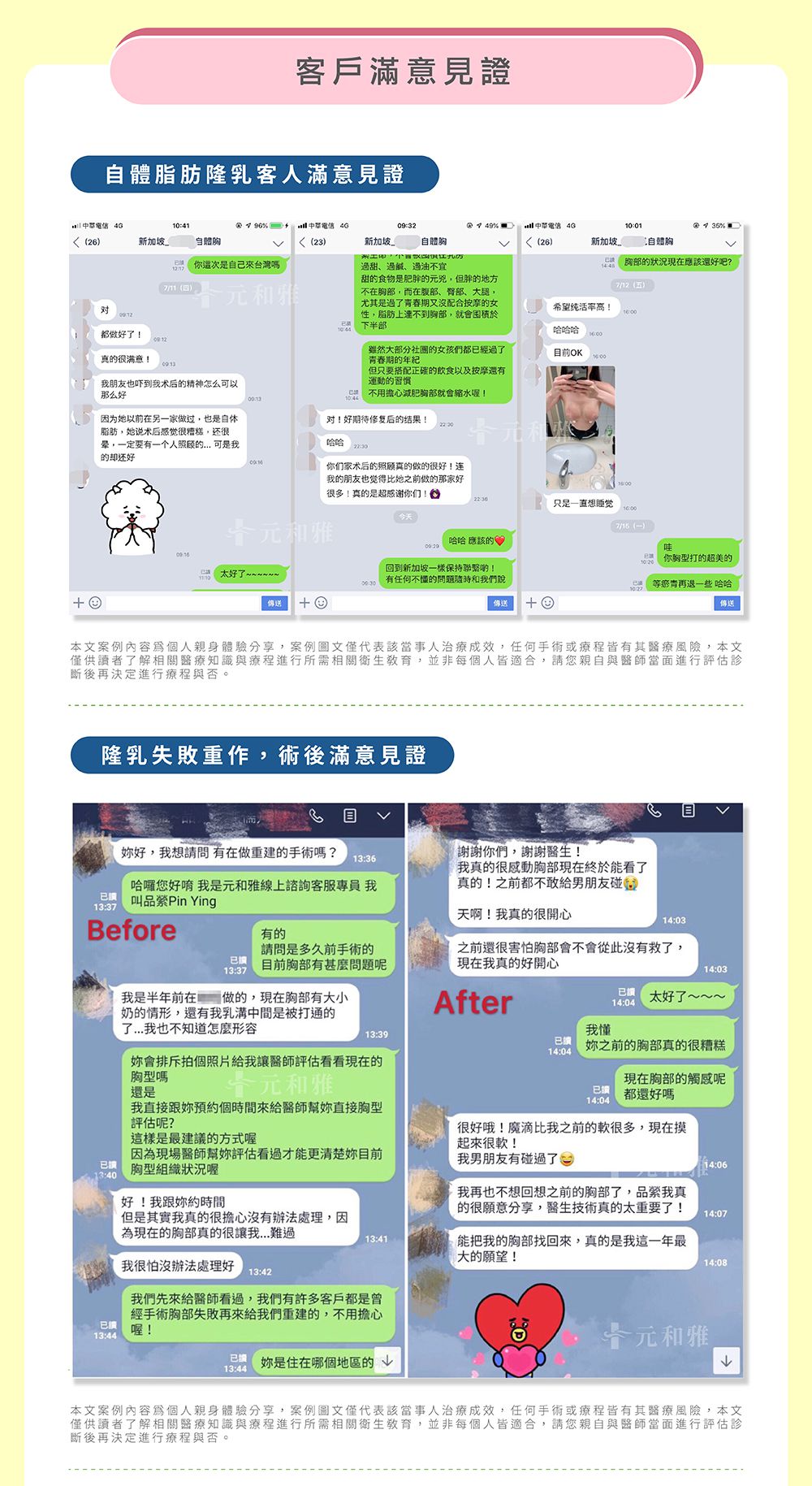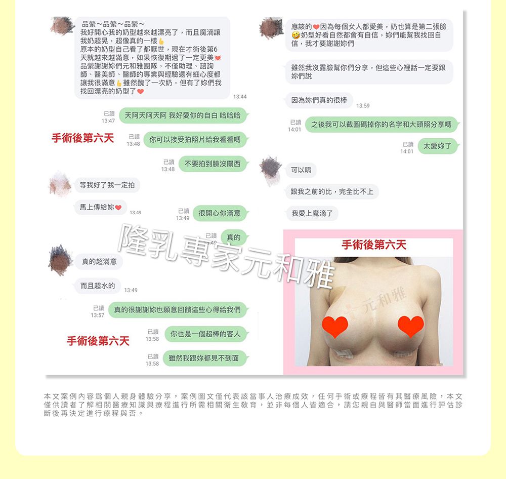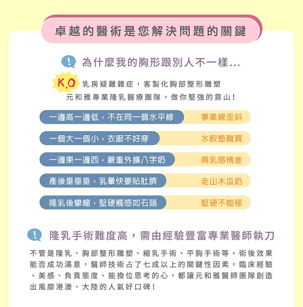 不管是隆乳、胸部整形雕塑、縮乳手術、平胸手術等,術後效果能否成功滿意,醫師技術占了七成以上的關鍵性因素,臨床經驗、美感、負責態度、能換位思考的心,都讓元和雅整形外科醫師團隊創造出風靡港澳、大陸的人氣好口碑!